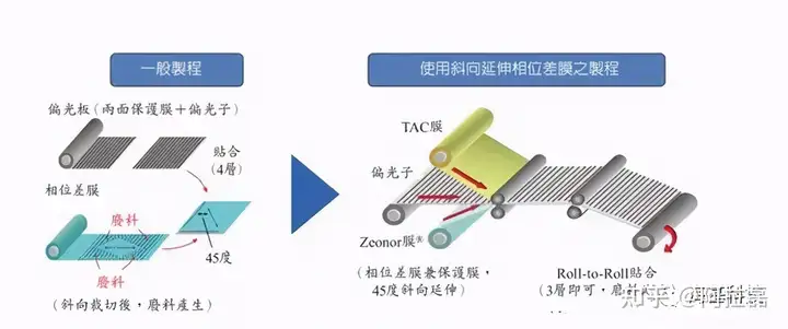 一般相位差膜与使用斜向延伸相位差膜之偏光片制程比较