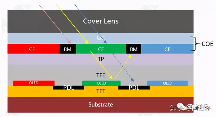 Color On Encapsulation(COE),顾名思义,就是在封装层外面再做一层Color Fliter。