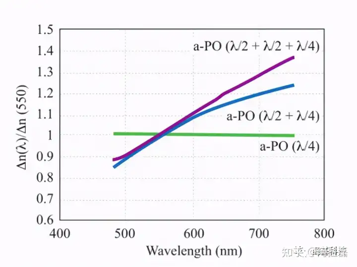 折射率分布差异不大(Flat Dis-persion)材料做成1/2λ波板,再与窄波域正常分布(Normal Dispersion) 的1/4λ波板,以直交或非直交的方向堆栈,Re值相减后,便可对光波长形成一近似理想线性的关系,可有效提升圆偏光在暗态的遮蔽情形。