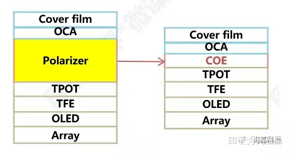 创新:OLED去偏光片黑科技-COE工艺AMOLED中的圆偏光片用于减少反射。虽然它在减少反射方面做得很出色,但是却将显示厚度增加了50µm至100µm,并降低了亮度。