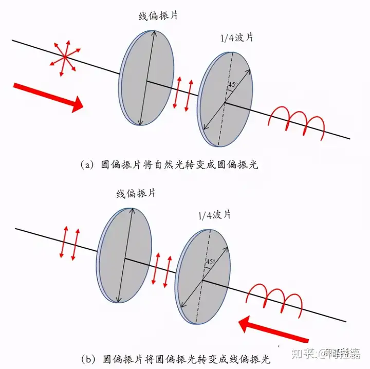 经过最外的线偏光片,光源仅剩一半的线性偏振,经过下夹角45˚的1/4λ波长波板可将线性偏振转换至圆偏振光(ex.左旋光);