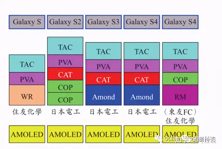三星智能型手机Galaxy系列皆使用AMOLED面板,从第一代产品Galaxy S开始,这一整个系列面板,评估选择的偏光片所需搭配之宽波域补偿膜,因成本问题与补偿效果之间存在着角力拉锯。