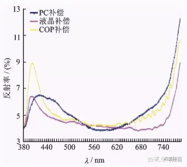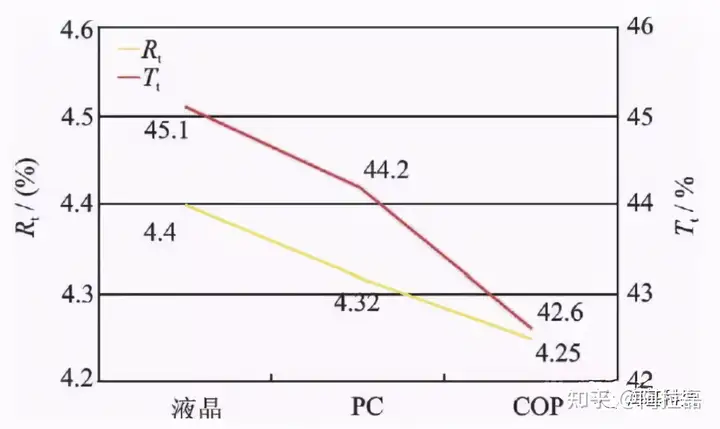 但如果结合透过率来考虑(使用相同的偏光片,透过率是45.2%),贴合液晶补偿膜、PC补偿膜和COP补偿膜后,下图为不同补偿材料反射率Rt和透过率Tt对比图,可以看出: