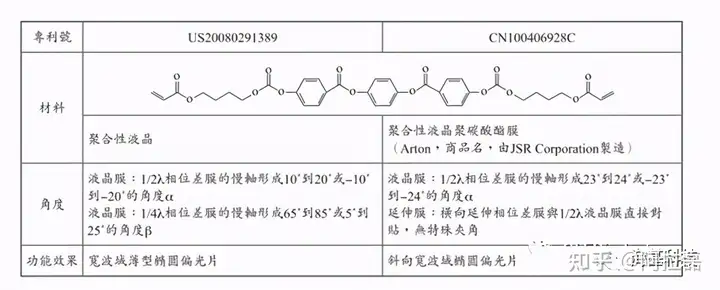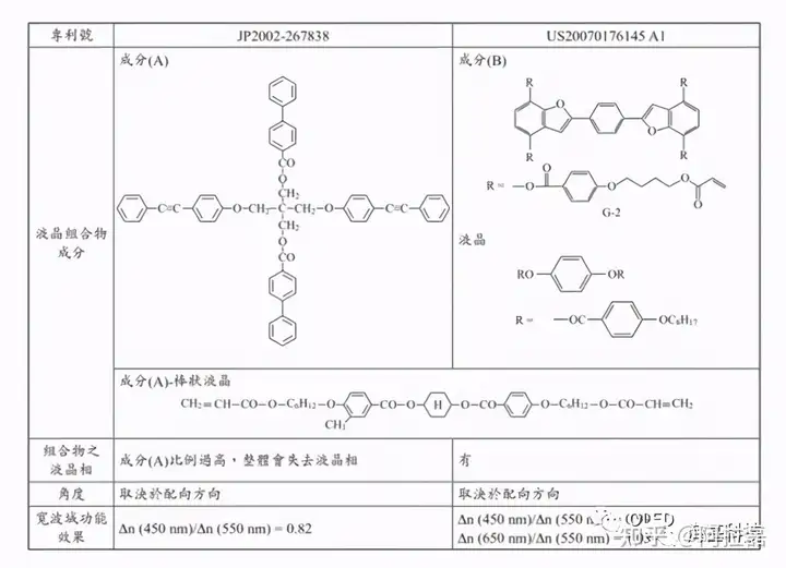 为了解决此问题,Fu-jifilm提出利用一种液晶组合物如下表所示,即可达到宽波域波长分布的专利,类似帝人化成单膜宽波域的概念。
