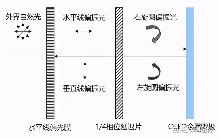 在OLED外部再加上圆偏振片便是其中一个解决方法。