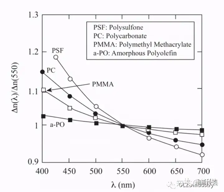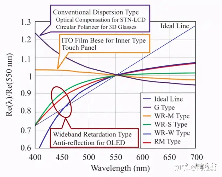 因此在可见光范围之折射率分布为正斜率,造成其相位差膜大多为窄波域(Narrow Band),仅在波长550nm附近可将光完全转换成另一个偏振态。